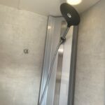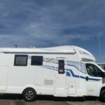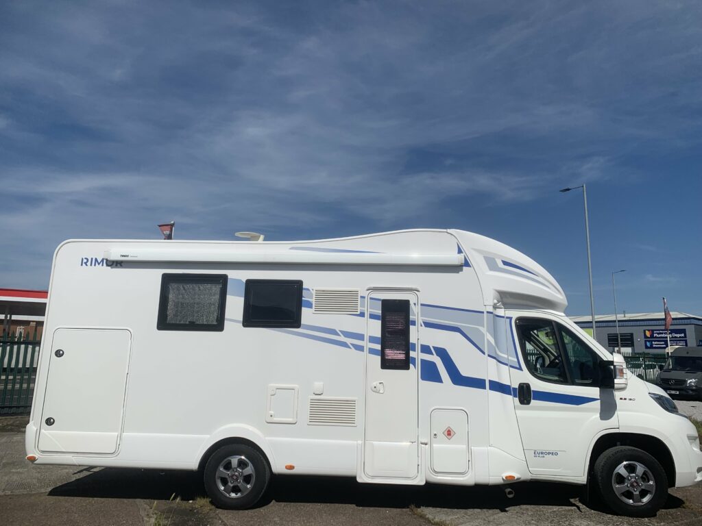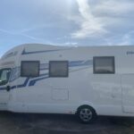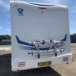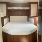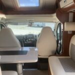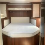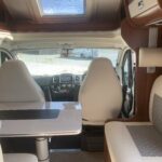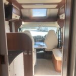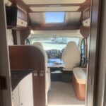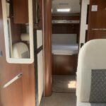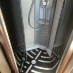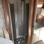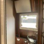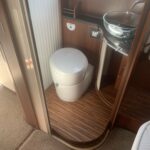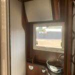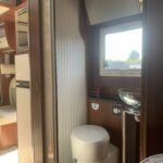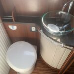- The bathroom is equipped with a Thetford toilet, shower, and vanity wash basin