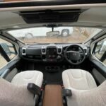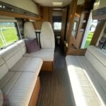 4 berths, 4 belts. The lounge area converts into a double bed. Over cab double bed. The rear bathroom area consists of a Thetford cassette toilet, a vanity washbasin, and a separate shower cubicle. The kitchen area is equipped with a sink, oven and grill, 4 combi hob, microwave, and a Thetford fridge with freezer compartment. Small garage space.