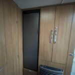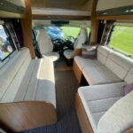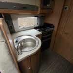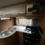 • The kitchen area is equipped with a sink, oven and grill, 4 combi hob, microwave, and a Thetford fridge with freezer compartment