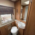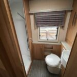 • The rear bathroom area consists of a Thetford cassette toilet, vanity washbasin, and a separate shower cubicle