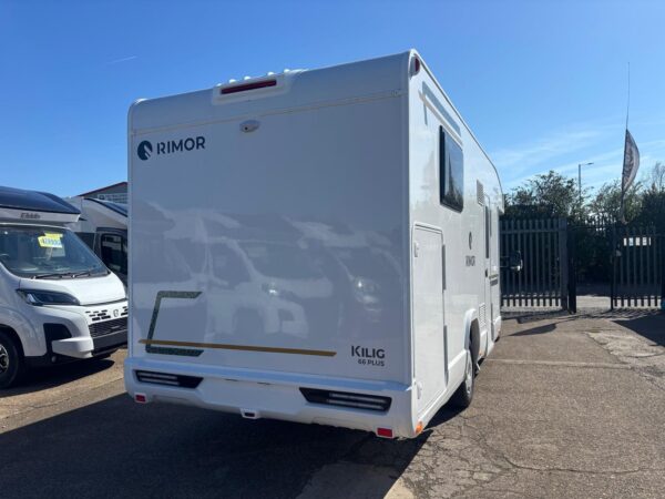 - Rimor Kilig 66 2026 A 4 berth motorhome with 4 travel seats. Consists of a rear double island bed, and an electric drop-down double bed at the front. Kitchen unit equipped with 3 burner hob, sink, and a 141L fridge with freezer compartment. This new layout…