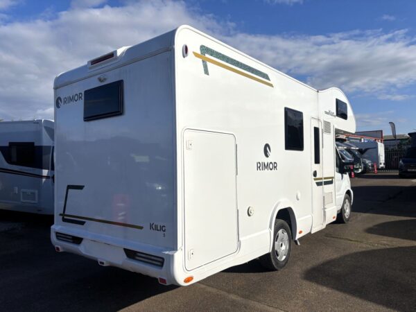 - Rimor Kilig 69 2026 A 5 berth motorhome with 5 travel seats. Consists of a rear double island bed, an electric drop-down double bed at the front and a L shape front dinette. Kitchen unit equipped with 3 burner hob, sink, and a 141L fridge with…