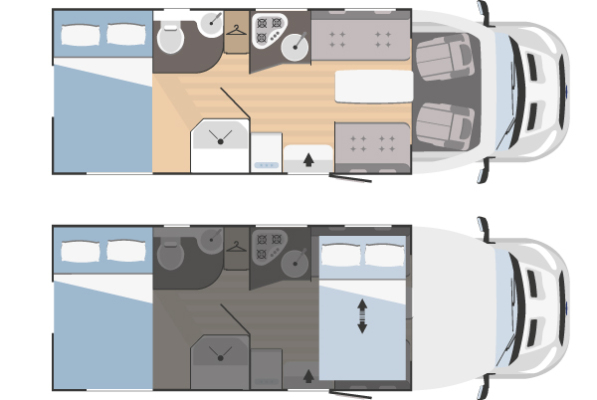 - Rimor Kilig 66 2023 A 4-berth motorhome with 4 travel seats. The layout consists of a rear island double bed. Electric drop-down double bed at the front. Kitchen unit equipped with 3 burner hob, sink and 141L fridge freezer, oven. 79L Fresh Water & 120L Waste…