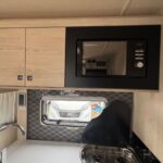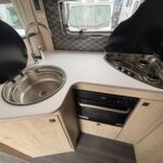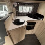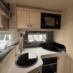 - The central kitchen is well equipped with a 3-burner hob, Thetford oven and grill, sink and large fridge freezer, and Microwave