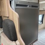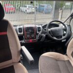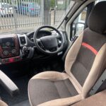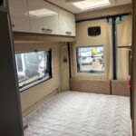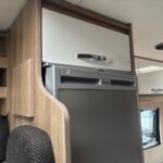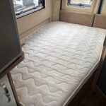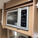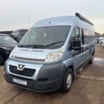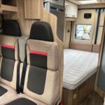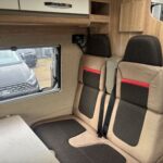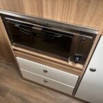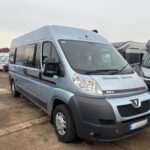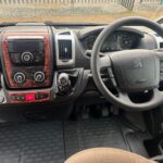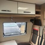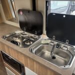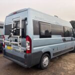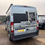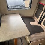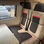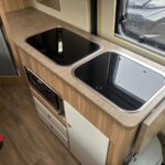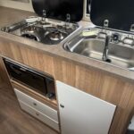 A 3-berth campervan. The layout consists of a rear French double bed. The front dinette area converts to a single bed. The central kitchen is well equipped with a 2-burner hob, sink, oven, microwave and fridge freezer. The rear washroom consists of a Thetford cassette toilet, pull down vanity washbasin and a shower.