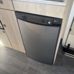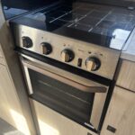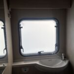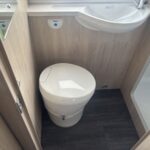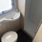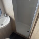 The bathroom is modern and spacious with a shower cubicle, Therford cassette toilet, and washbasin
