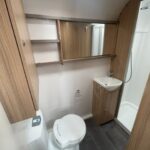- The rear bathroom contains a Thetford cassette toilet, vanity washbasin, and a shower cubicle