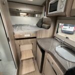A 2-berth motorhome with a rear fixed double bed. Front dinette area. The kitchen is well equipped with a Thetford 3 burner hob, oven and grill, fridge freezer, sink, and microwave. Bathroom with shower cubicle, Thetford cassette toilet, and vanity washbasin. Garage space under the rear bed.