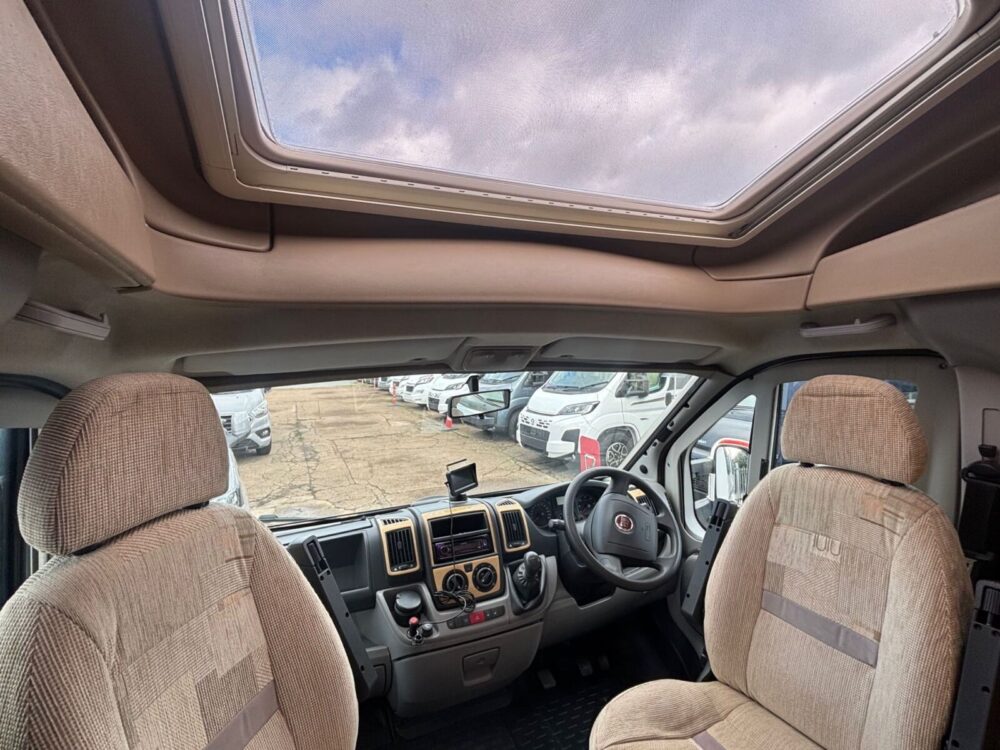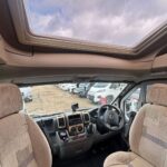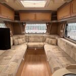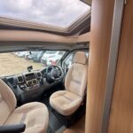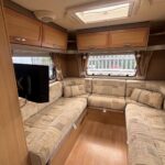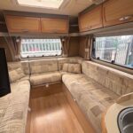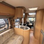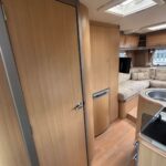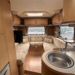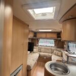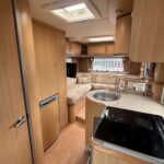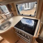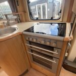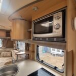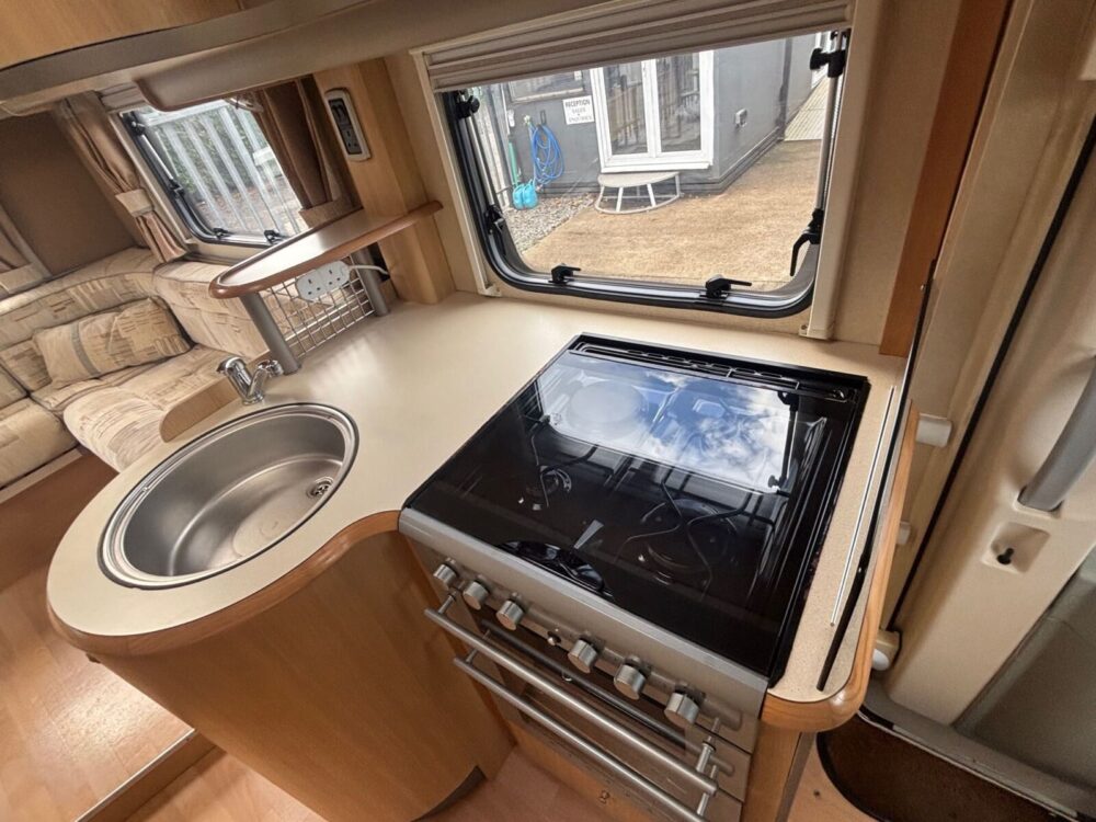 - The central kitchen is well-equipped with a 4-burner hob, oven and grill, Microwave, sink and a Thetford fridge freezer