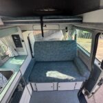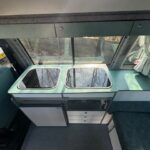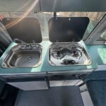 - The kitchen area is equipped with a sink, Smev 2 burner hob, Smev grill and Dometic fridge freezer