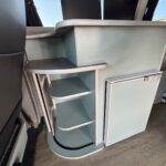 - The kitchen area is well equipped with a 2 burner hob, sink, and fridge