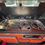 - The kitchen area is well equipped with a burner hob, sink, oven and fridge