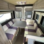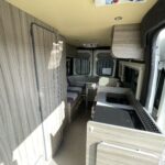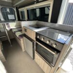 - The kitchen is equipped with a Thetford oven and grill, 3 burner hob, Dometic fridge, and freezer
