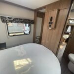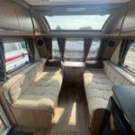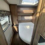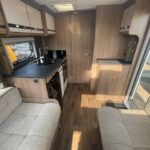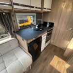 - Well-equipped kitchen with 4 burner combi hob, Thetford oven and grill, Thetford fridge with freezer compartment, a sink with a Caraflo tap, and a Sharpe microwave