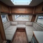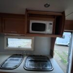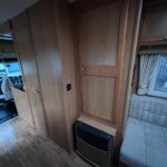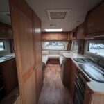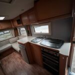 - The kitchen is equipped with a Thetford oven and grill, 3 gas burner hob, microwave and 3 way Dometic fridge freezer, and sink