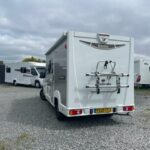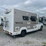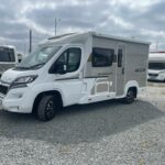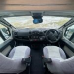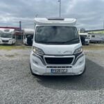 2-berth motorhome. The front lounge converts to a double bed. Rear bathroom with shower cubicle, Thetford cassette toilet, and vanity washbasin. Kitchen equipped with Thetford oven and grill, hob, sink, Dometic fridge freezer, and Russell Hobbs microwave.