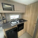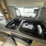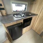 • Kitchen equipped with Thetford oven and grill, hob, sink, Dometic fridge freezer, and Russell Hobbs microwave