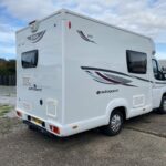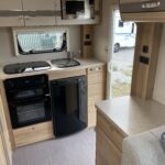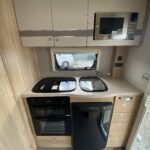 - Rear Kitchen equipped with 3 burner hob, sink, microwave, Dometic fridge, Thetford oven, and grill