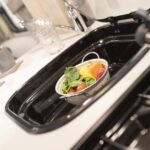 - Black gloss enamelled sink with glass lid creating additional work surface and removable drainer