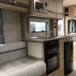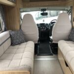 This 4 berth with 4 travel seat motorhome is fully equipped with a rear lounge that converts into a double bed or two single beds, and a front lounge makes up into two travel seats. The kitchen is equipped with a 3 burner hob, sink, fridge, oven/grill, and microwave. The bathroom is equipped with a Thetford toilet, shower, and vanity washbasin. This motorhome comes with extras such as tv, reverse camera, 4 bike rack, and awning. Perfect for traveling!
