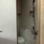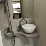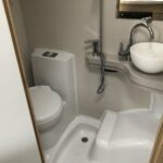 • The bathroom is equipped with a Thetford toilet, shower, and vanity washbasin