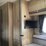 - Electric double drop-down bed situated above the front lounge
