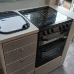 • ‘Tibero with Platino & Linum Haithabu material scheme, handcrafted dove-tailed drawers, ‘Quiet-Close’ overhead lockers, removable shelves, co-ordinating flush-fit kitchen units with Chrome inset detail and positive locking throughout