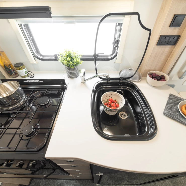 • Black gloss enamelled sink with glass lid creating additional work surface and removable drainer