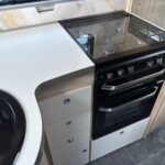 - Thetford K1520 MK2 Black Gloss Oven, grill and dual fuel hob with spark ignition and 800w electric hotplate, three gas burners with smoked glass