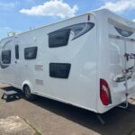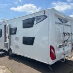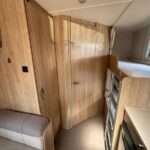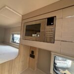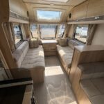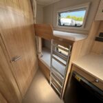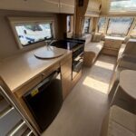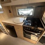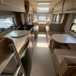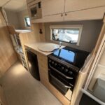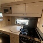 - The kitchen area is well-equipped with 4 burner combi hob, Thetford oven and grill, Dometic fridge with freezer compartment, Daewoo microwave and sink