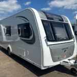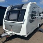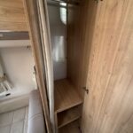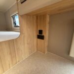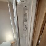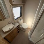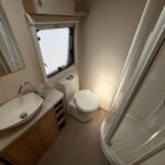 - The rear washroom layout consists of a vanity washbasin, Thetford cassette toilet and a separate shower cubicle