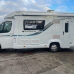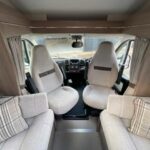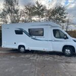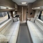 Gas and electric heating and hot water. Dinette converts into a double bed. The kitchen area is well equipped with an oven and grill, Dometic XL fridge with freezer compartment, Russel Hobbs microwave, 3 burner hob, and sink. The rear bathroom contains a Thetford cassette toilet, a vanity washbasin, and a separate shower cubicle. Freestanding dining table. Sockets throughout the motorhome.