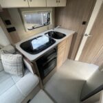 • The kitchen area is well equipped with an oven and grill, Dometic XL fridge with freezer compartment, Russel Hobbs microwave, 3 burner hob and sink