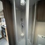 • The rear bathroom contains a Thetford cassette toilet, a vanity washbasin, and a separate shower cubicle