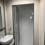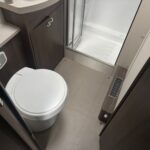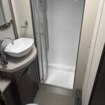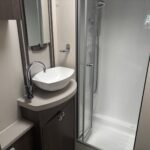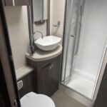 - Rear bathroom with shower cubicle, Thetford cassette toilet, and vanity washbasin