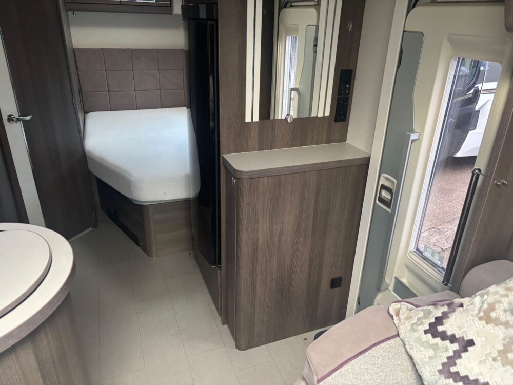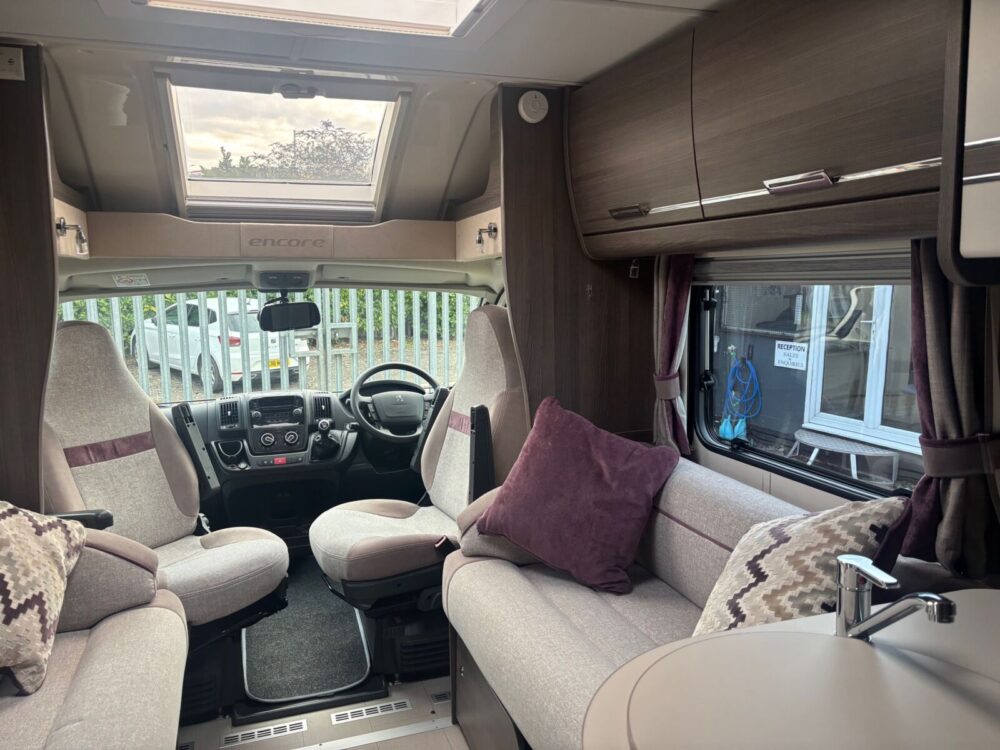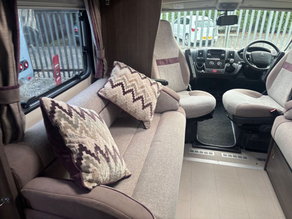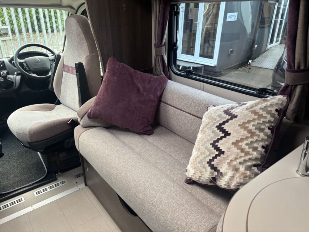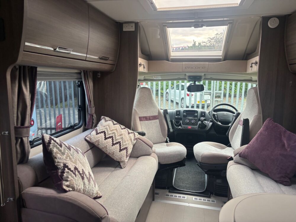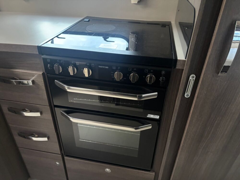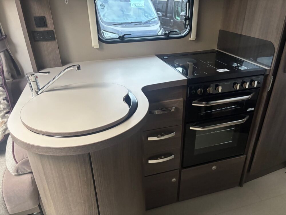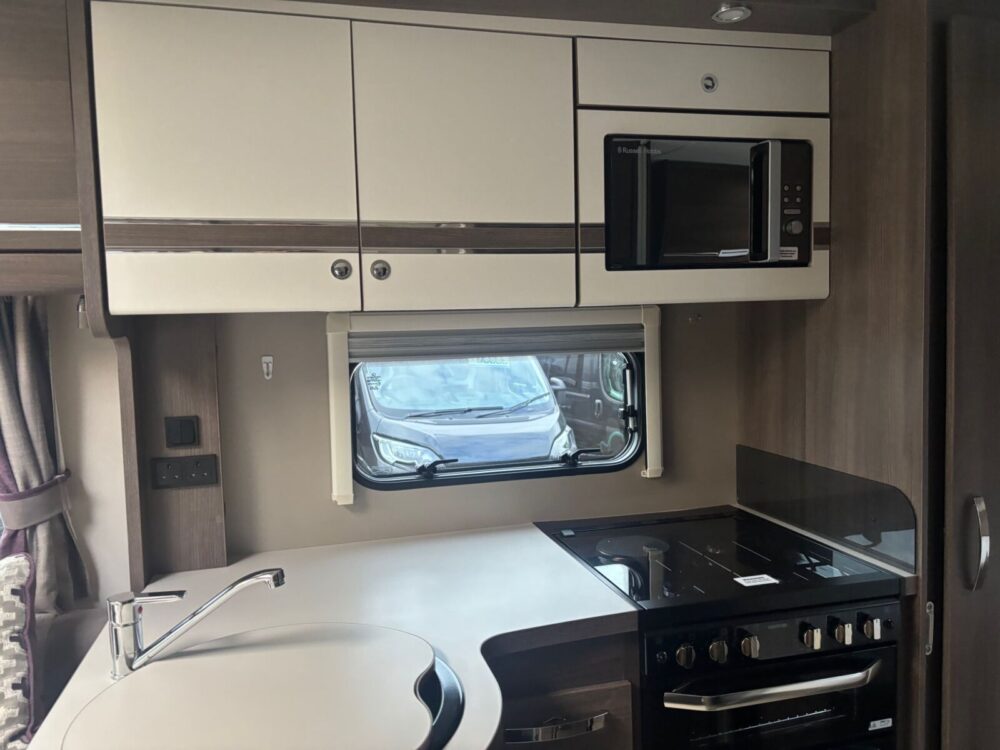 • The kitchen is well equipped with a 4-burner hob, Thetford oven and grill, Dometic fridge freezer, microwave and sink