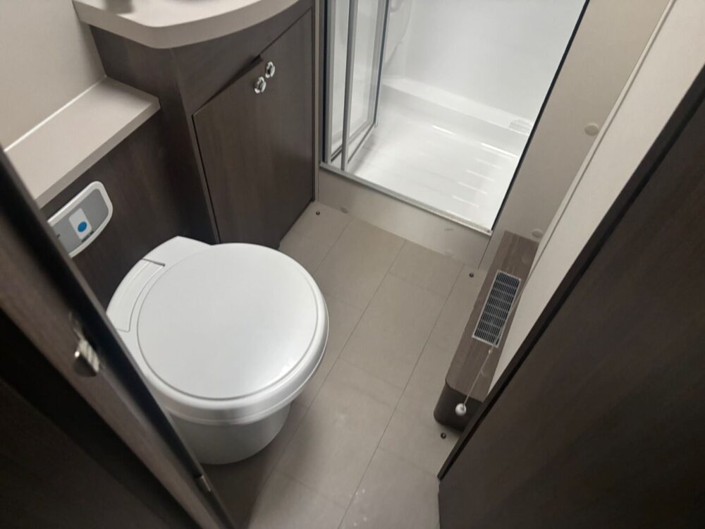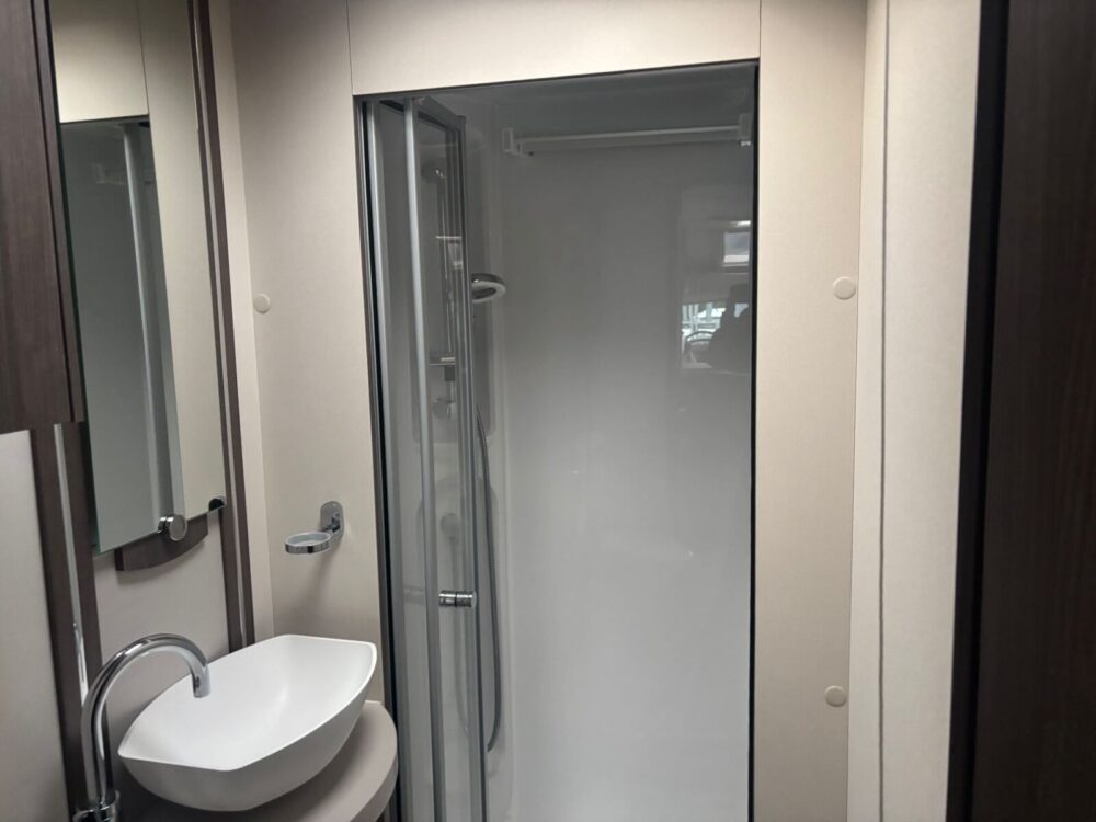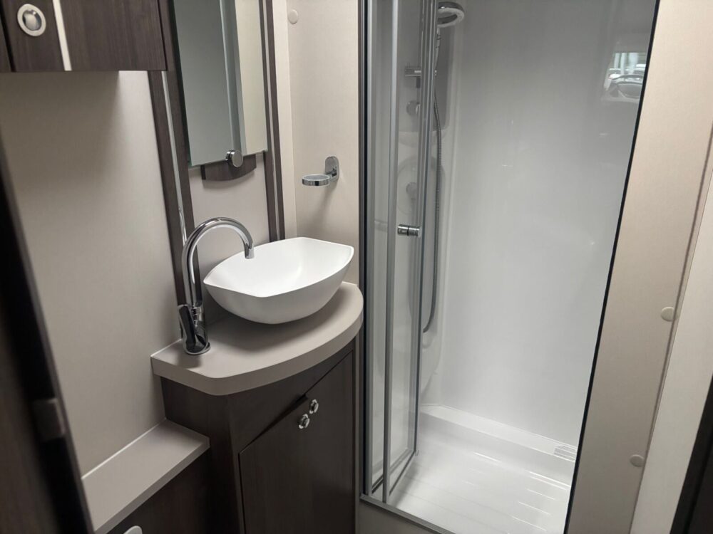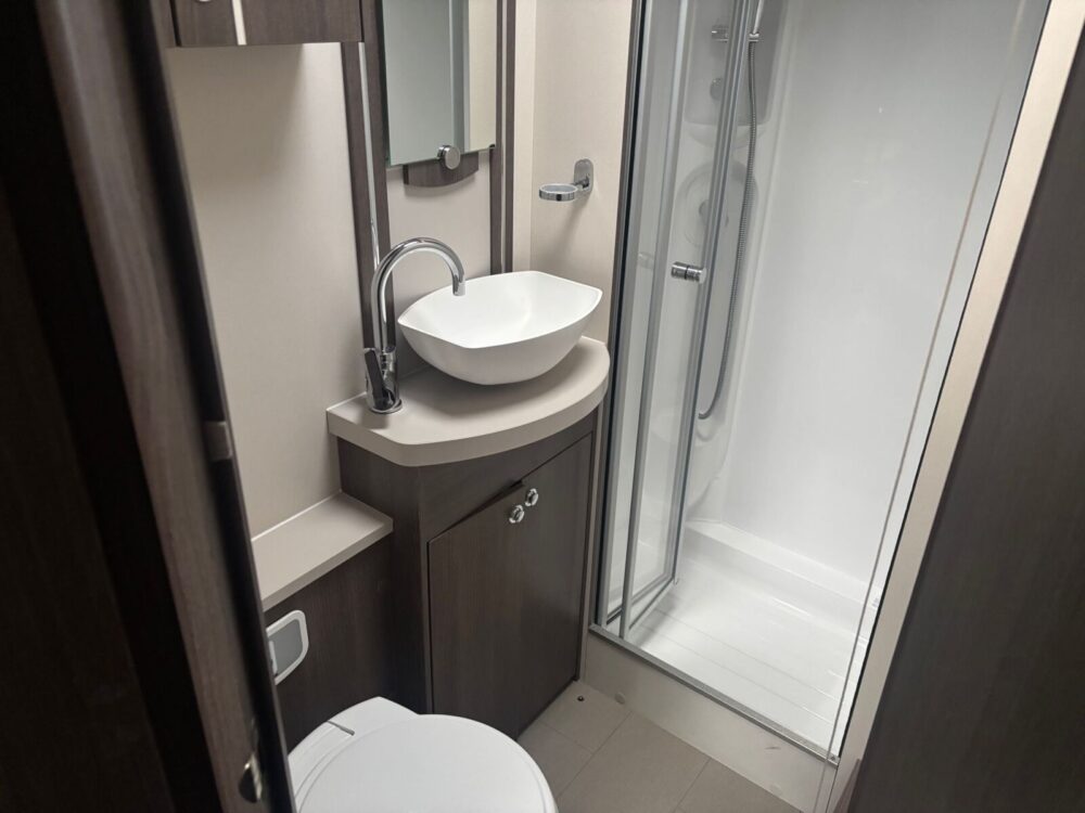 • Rear bathroom with shower cubicle, Thetford cassette toilet, and vanity washbasin