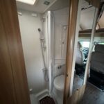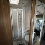 - The washroom is equipped with a Thetford cassette toilet, pull-out washbasin, and shower