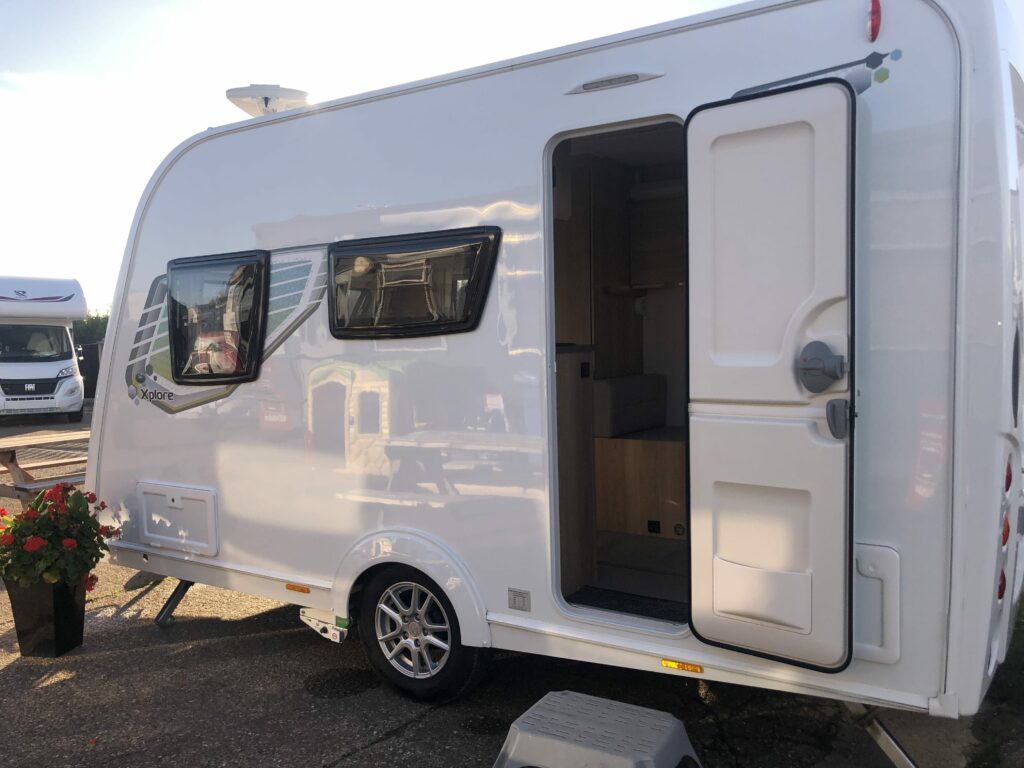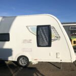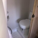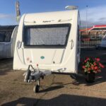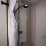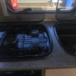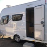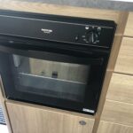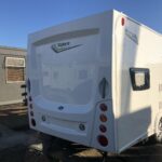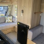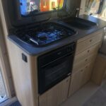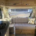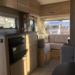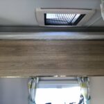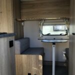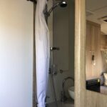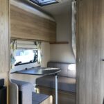- The bathroom is equipped with a Thetford toilet, shower, and vanity washbasin.