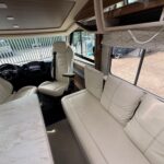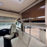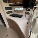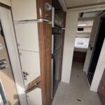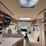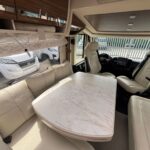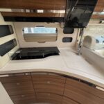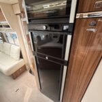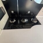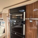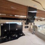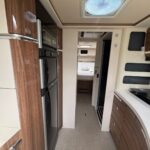 • The central kitchen is equipped with a 3-burner hob, sink, Dometic fridge freezer, and oven