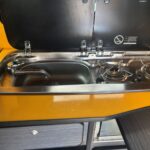 - The kitchen area is equipped with a 2 burner hob, sink, fridge and grill