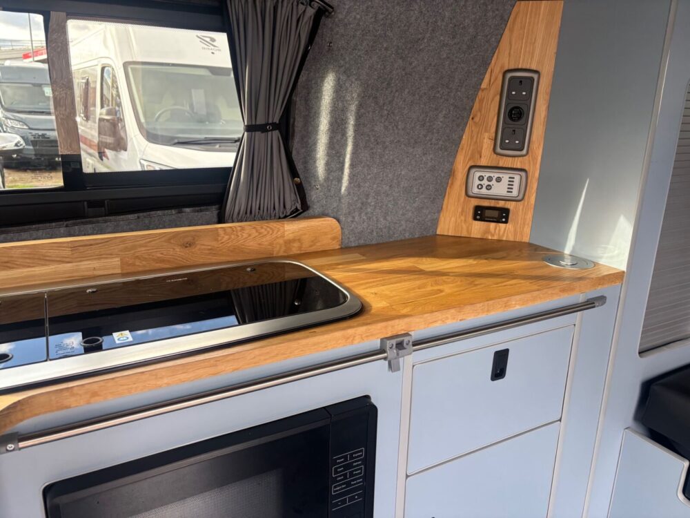 - The kitchen is well equipped with a 2-burner gas hob, sink, microwave and fridge