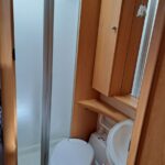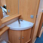 - Bathroom contains a Thetford cassette toilet, vanity washbasin and shower cubicle