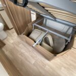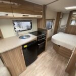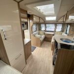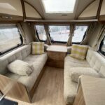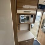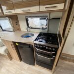 - Kitchen equipped with 4 burner combi hob, Thetford oven and grill, Dometic fridge with freezer compartment, sink and microwave
