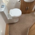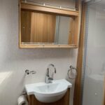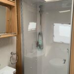 • The bathroom is equipped with a Thetford toilet, shower, and vanity wash basin.
