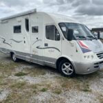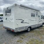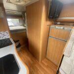 - Kitchen equipped with a 3 burner hob, sink, and a large Dometic fridge freezer