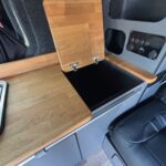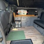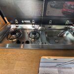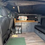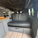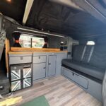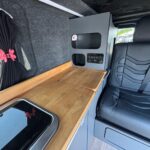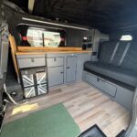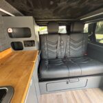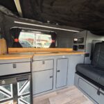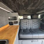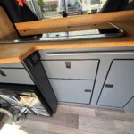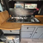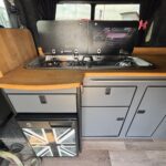- The kitchen area contains a 2 burner hob, sink and fridge freezer