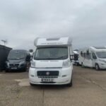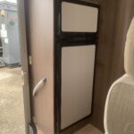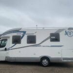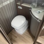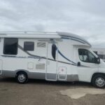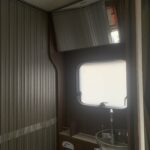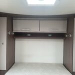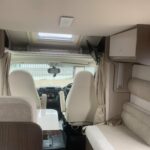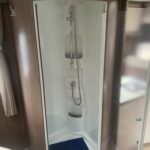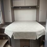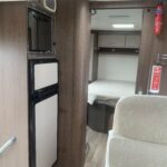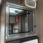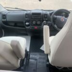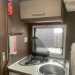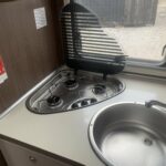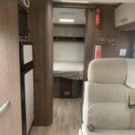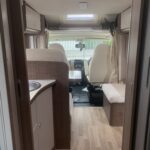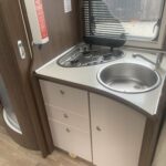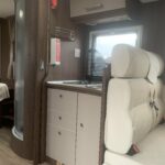 - The kitchen is fully equipped with a 3 burner hob, sink, oven, grill, Thetford fridge, and freezer