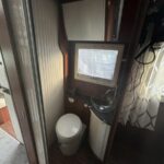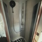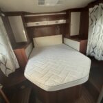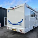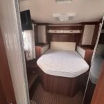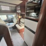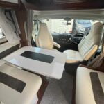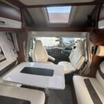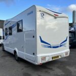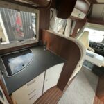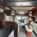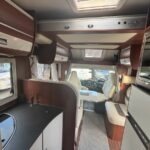 A 5-berth motorhome. Rear fixed island double bed. Front electric drop-down double bed. The front dinette converts to a small bed. Kitchen equipped with 3 burner hob, Dometic grill, fridge freezer, and sink. Separate shower cubicle. Vanity washbasin and Thetford cassette toilet.