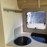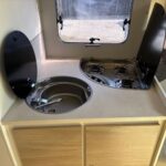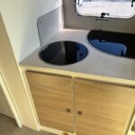 - Kitchen unit equipped with 3-burner hob, sink, and a 141L fridge freezer, Oven